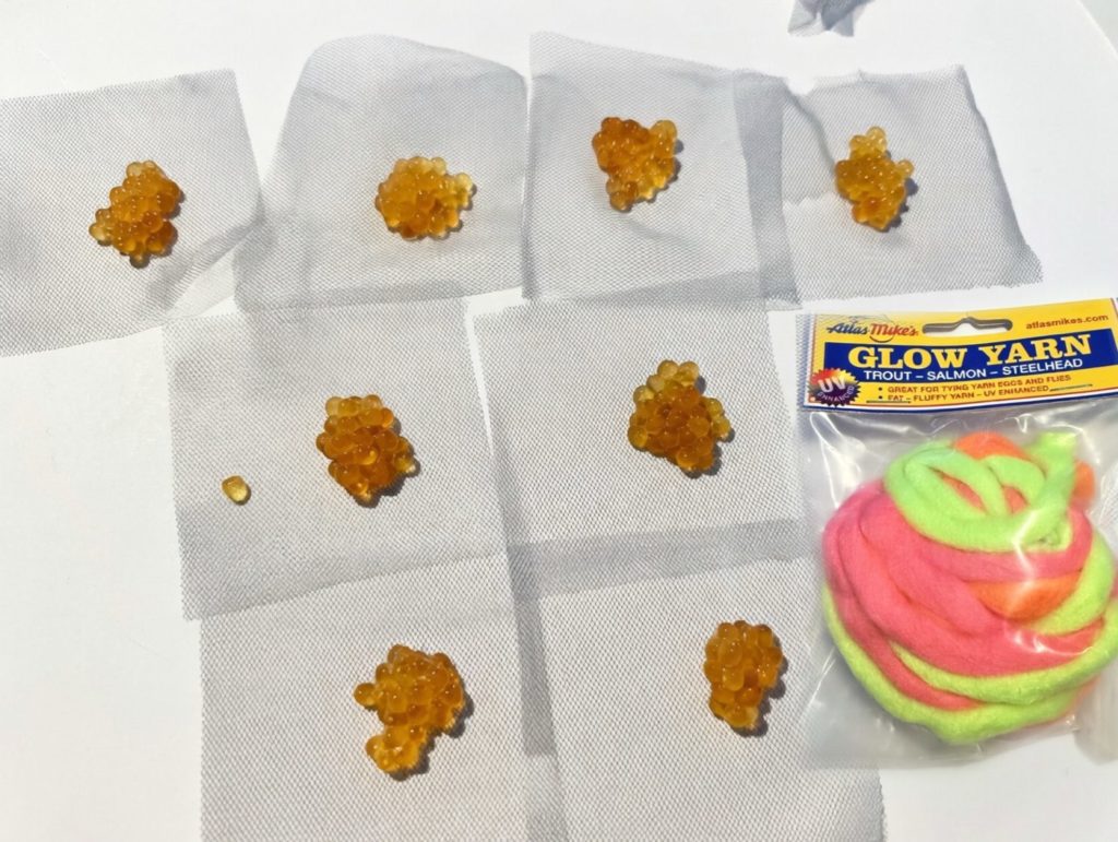 Most of us know how to tie egg sacs. Lay out your favorite color of 3×3 Atlas Mike’s spawn netting. I fill it with Natural BorX O Fire cured eggs and then cut a piece of yarn. I’ve been using Atlas Mike’s Glow Yarn. Place the yarn on top of the spawn (BorX O Fire cured eggs) and tie the bag. Many anglers using various colors of Magic Thread. I’ve been using Miracle Thread Clear.