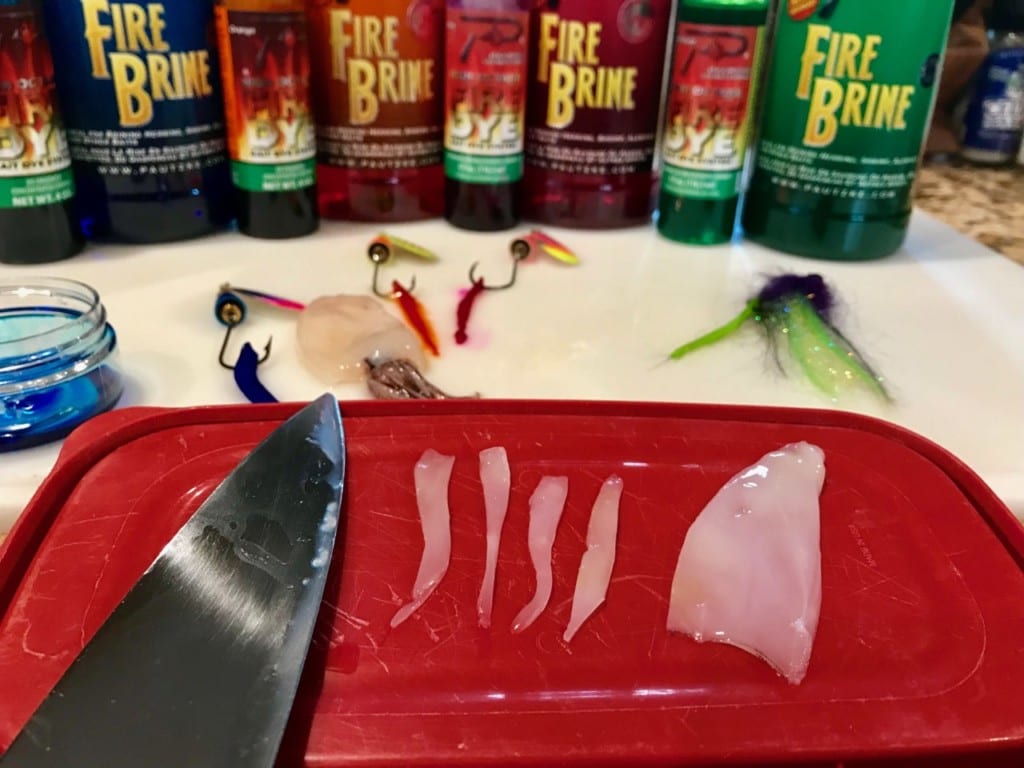 If I have time to prepare bait the night before I cut the squid into the size strips that I want for the next days application by placing them in a Ziploc and pour in Fire Brine and Fire Dye. You only need enough brine/dye to submerge the squid. Then let it soak overnight to take the color and toughen up the bait. I like to cut the squid the night before if I can using a very sharp fillet knife to achieve the size and thickness that I am looking for. If using for travel or steelhead, I will cut them into longer straps.